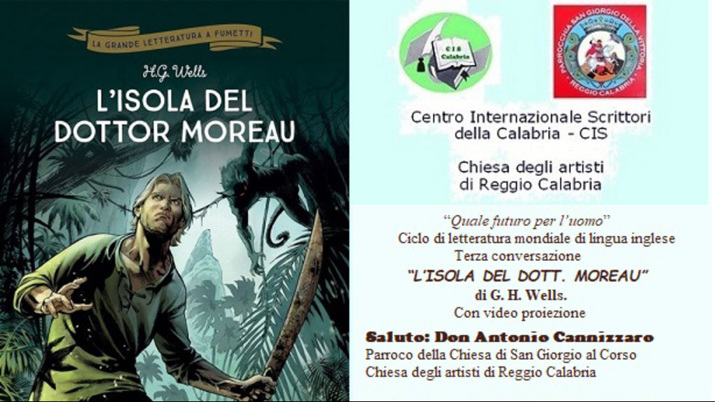 Mercoledì 19 ottobre 2022 alle ore 17:30, nel Salone della chiesa di San Giorgio, chiesa degli artisti di Reggio Calabria, il Centro Internazionale Scrittori della Calabria e la stessa chiesa, nell’ambito del Ciclo di Letteratura mondiale di lingua Inglese “La natura e lo stupore dell’artista” promuovono la conversazione su G. H. Wells, autore del romanzo L’isola del dott. Moreau.