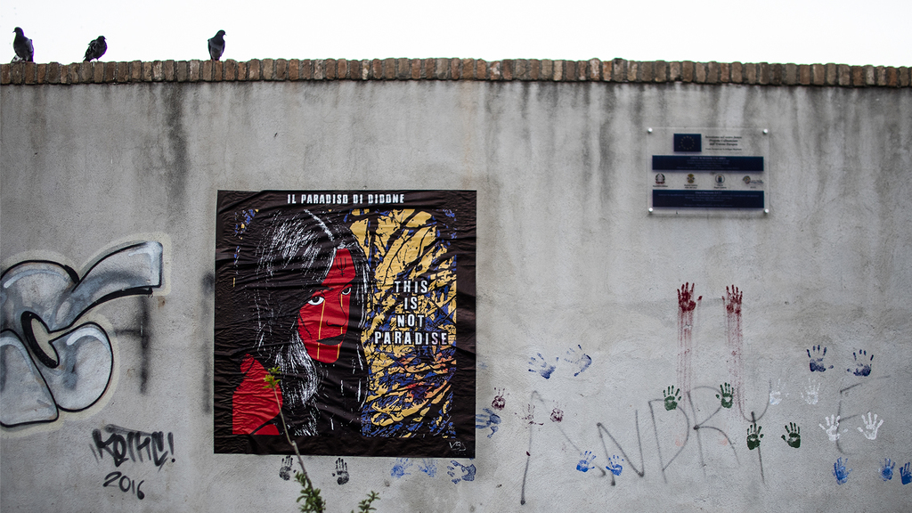 “Il paradiso di Didone” è il titolo della sua nuova opera di critica culturale e sociale affisso su un muro di piazza Canonico, il luogo simbolo di una rinascita, di un abbandono, di nuova una ripresa grazie ad un gruppo spontaneo di volontari. Il messaggio, “this is not paradise” (questo non è il paradiso) è un’analogia storico-letteraria tra il suicidio di Didone e l’autoannientamento progressivo del contesto culturale e sociale, di per se già povero o in alcuni casi inesistente; evidente il richiamo alla narrazione della Didone abbandonata, che lascia la propria Cartagine a un destino tragico, suicidandosi per amore dopo la partenza di Enea, una similitudine allegorica con l’individualismo e il narcisismo radicati nel cittadino di questa terra, che si è fatto sorprendentemente comunità in una piazza che è un intreccio di tempi e di luoghi, di persone e di simboli, dove una dinamica virtuosa supporta la  collettività sociale e culturale.