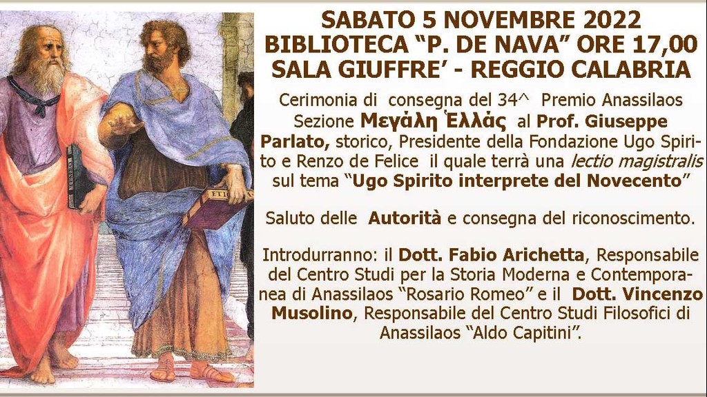 Al Prof. Giuseppe Parlato, storico e Presidente dal 2008 della Fondazione Ugo Spirito e Renzo De Felice, sabato 5 novembre alle ore 17,00 presso la Sala Giuffrè della Biblioteca “Pietro de Nava” sarà conferito Premio Anassilaos Μεγάλη Ἑλλάς per la Ricerca Storica.
