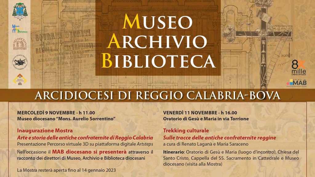 Secondo appuntamento del Progetto MAB sarà venerdì 11 novembre h 16 con un trekking culturale guidato dall’architetto Renato Laganà e dalla storica dell’arte Maria Saraceno: partendo dall’Oratorio di Gesù e Maria in via Torrione (luogo d’incontro dei partecipanti) proseguirà nella chiesa del Santo Cristo e nella cappella del SS. Sacramento in Cattedrale per poi concludersi con una visita alla Mostra allestita nel Museo diocesano.