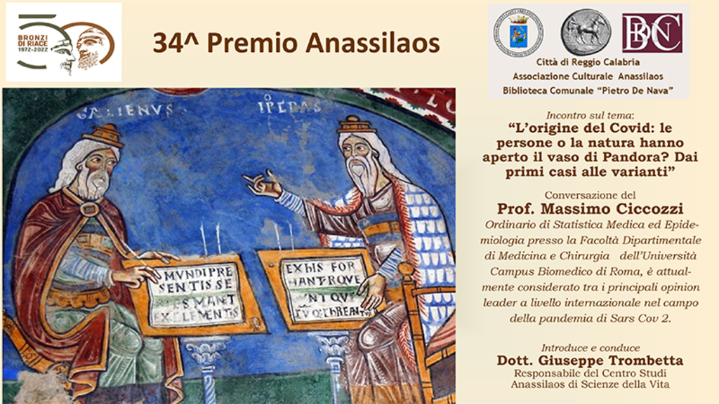 “L’origine del Covid: le persone o la natura hanno aperto il vaso di Pandora? Dai primi casi alle varianti” sarà il tema della conversazione che il Prof. Massimo Ciccozzi, Ordinario di Statistica Medica ed Epidemiologia presso la Facoltà Dipartimentale di Medicina e Chirurgia dell’Università Campus Biomedico di Roma, è attualmente considerato tra i principali opinion leader a livello internazionale nel campo della pandemia di Sars Cov 2, terrà in occasione della 34^ edizione del Premio Anassilaos questo pomeriggio (17 novembre) alle ore 17,00 presso la Sala Giuffrè della Biblioteca Comunale “P. De Nava” nell’ambito degli incontri promossi dall’Associazione Anassilaos, congiuntamente con la Biblioteca e patrocinati dal Comune di Reggio Calabria. A darne notizia, un comunicato dell'associazione Anassilaos.