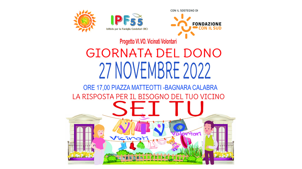 Prendono vita sulla fascia tirrenica le nuove iniziative promosse in seno al progetto “VI.VO.”- Vicinati Volontari sostenuto dalla "Fondazione con il Sud”, capofila l’Istituto per la Famiglia sez. 55 Condofuri (RC). L’evento “ Giornata del Dono”, promossa dai volontari ispirati dallo slogan del progetto “Illumina la tua vita, diventa volontario” sarà ospitato a Piazza Matteotti- Bagnara Calabra il 27 Novembre 2022 alle ore 17:00. A darne notizia, un comunicato dell'associazione Istituto per la Famiglia.