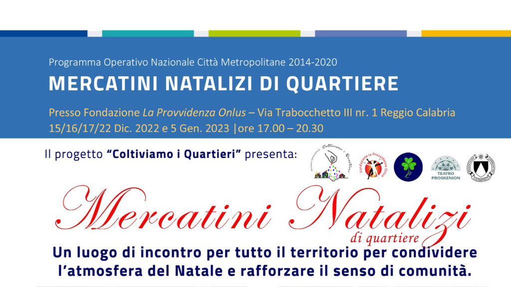 Nelle giornate del 15, 16, 17, 22 dicembre e del 5 gennaio - prosegue la nota - si svolgeranno, infatti, “I Mercatini Natalizi di Quartiere”, il primo di una serie di eventi pubblici che consentiranno di scoprire un quartiere affascinante, situato al centro della città di Reggio Calabria, anticamente denominato “del Trabucco”. L’unico ad avere mantenuto inalterata la propria struttura stradale a seguito del terremoto del 1908. L’evento consentirà anche di conoscere una realtà sociale e territoriale che giornalmente si impegna in ambito sociale, quale la Fondazione “La Provvidenza” ONLUS, che gestisce proprio in via Trabocchetto due centri diurni per minori e un servizio di assistenza domiciliare socio-educativo per minori, oltre alle associazioni sopra menzionate, sempre presenti nel territorio rionale e che da anni contribuiscono al benessere della collettività.