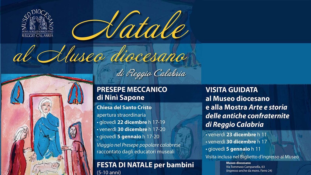Nel periodo natalizio il Museo diocesano riserverà speciali visite guidate alla Collezione permanente e alla Mostra “Arte e storia delle antiche confraternite di Reggio Calabria”: prossimi appuntamenti venerdì 30 dicembre h 17 e giovedì 5 gennaio h 11 (gratuita e inclusa nel biglietto d’ingresso).