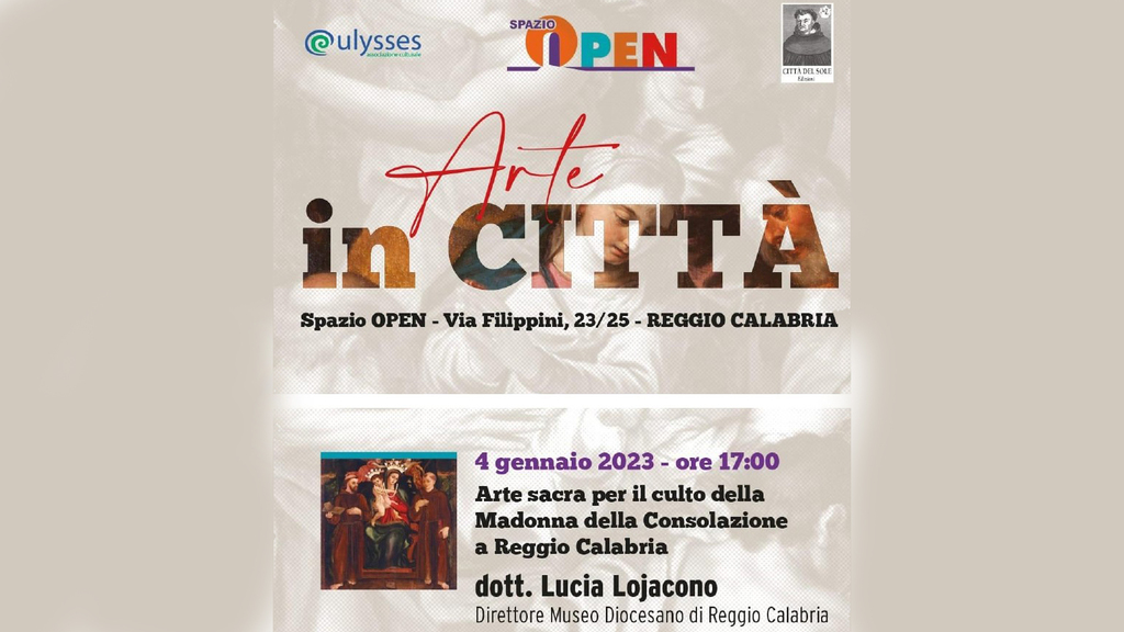 Mercoledì 4 gennaio, presso Spazio Open, il prossimo incontro #arteincittà. La dottoressa Lucia Lojacono, storico dell’arte e direttrice del Museo diocesano di Reggio Calabria, interverrà sul tema “Arte sacra per il culto della Madonna della Consolazione a Reggio Calabria”. A renderlo noto, un comunicato dell'associazione Ulysses.