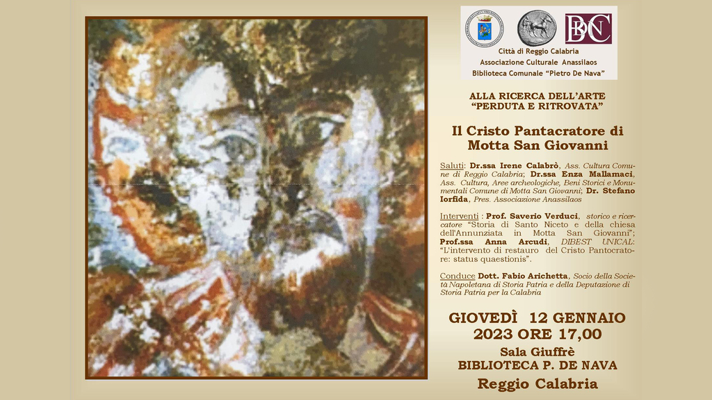 Per fortuna - prosegue il comunicato -, vi sono storie artistiche a lieto fine. E’ il caso del Cristo Pantacratore di Motta San Giovanni, collocato nell’abside crollata della chiesa di Santa Maria dell’Annunziata in prossimità del castello Santo Niceto”,  oggetto dell’incontro che si terrà giovedì 12 gennaio alle ore 17,00 presso la Sala Gioffrè della Villetta De Nava con la partecipazionedi  Irene Calabrò, Assessore alla Cultura del Comune di Reggio Calabria e di Enza Mallamaci, Assessore Cultura, Aree archeologiche, Beni Storici e Monumentali del Comune di Motta San Giovanni e gli interventi del Prof. Saverio Verduci, storico e ricercatore sulla “Storia di Santo Niceto e della chiesa dell'Annunziata in Motta San Giovanni” e della Prof.ssa Anna Arcudi, DIBEST UNICAL, che tratterà dell’ “Intervento di restauro  del Cristo Pantocratore: status quaestionis”.