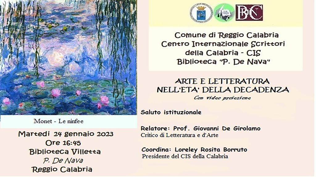 Promosso dal comune di Reggio Calabria, dal Centro Internazionale Scrittori della Calabria e dalla Biblioteca comunale “P. De Nava” nei locali della stessa Biblioteca, martedì 24 gennaio 2023, alle ore 16:45, nell’ambito del ciclo di incontri “Arte e letteratura” si svolgerà la conferenza “Arte e letteratura nell’età della decadenza”. A darne notizia, una nota del CIS della Calabria.