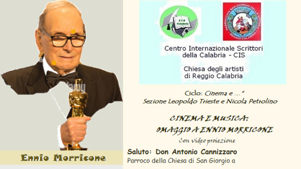 Il Centro Internazionale Scrittori e la chiesa degli artisti di Reggio Calabria, oggi mercoledì 25 gennaio 2023, alle ore 17:30, presso la Sala San Giorgio della stessa chiesa, nell’ambito del ciclo "Cinema e …" sezione Leopoldo Trieste e Nicola Petrolino, presentano: “Cinema e musica: omaggio a Ennio Morricone”. Aprono l’incontro gli interventi di don Antonio Cannizzaro, parroco della chiesa di San Giorgio al Corso e di Loreley Rosita Borruto, presidente del Cis della Calabria. La prof.ssa Maria Florinda Minniti, già docente di Italiano e Latino, componente del Comitato Scientifico del Cis, attraverso un video fotografico racconta l’itinerario biografico e artistico del maestro Ennio Morricone, (Roma, 10 novembre 1928 – Roma 6 luglio 2020). Ennio Morricone è stato compositore, direttore d’orchestra e arrangiatore italiano. La sua carriera include un'ampia gamma di generi compositivi, che fanno di lui uno dei più importanti, prolifici e influenti compositori cinematografici di tutti i tempi. Dagli anni settanta Morricone diventa un nome di rilievo anche nel cinema hollywoodiano, componendo musiche per registi americani. Nel 2007 ha ricevuto il premio Oscar alla carriera, ha vinto, inoltre, tre “Grammy Awards”, tre “Golden Globe”, 10 “David di Donatello” e numerosi altri premi.