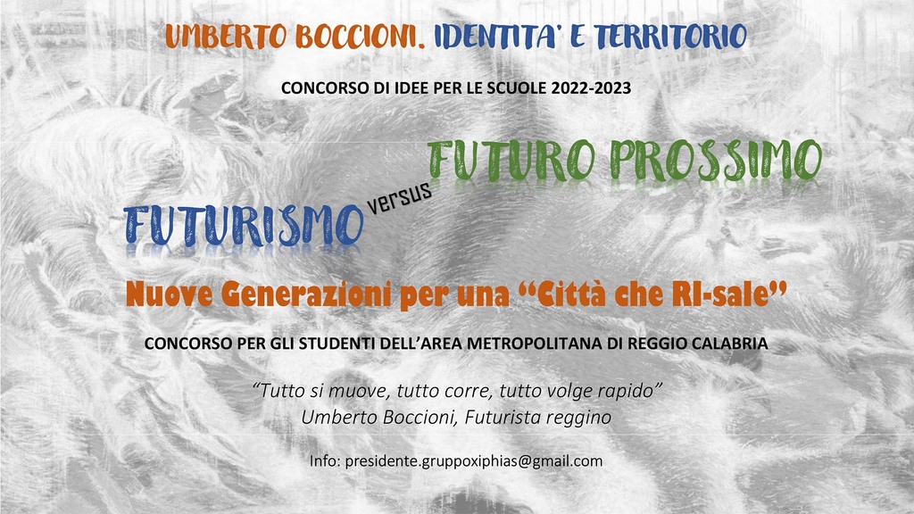 Il Gruppo Xiphias, associazione di sviluppo culturale diretta dal presidente Antonella Postorino, per rendere omaggio a Umberto Boccioni, in occasione dei 140 anni dalla sua nascita nella città di Reggio Calabria, ha diffuso tra i banchi di scuola un progetto rivolto agli studenti della Città Metropolitana, con l’intento di unire l’arte agli spazi urbani, così da diffondere, attraverso un concorso, la figura di uno dei maggiori esponenti della corrente Futurista italiana, ovvero una delle prime avanguardie europee del XX secolo.