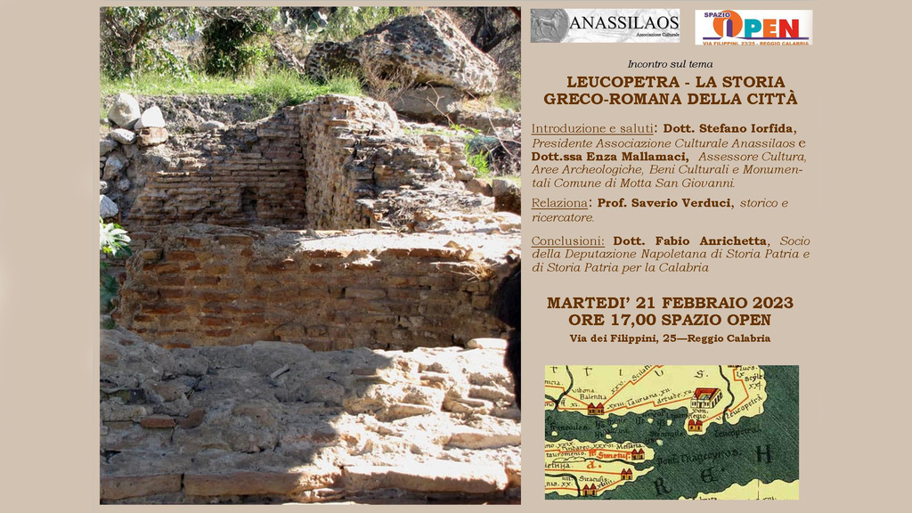 “Leucopetra - la storia greco-romana della città” è il tema dell’incontro, promosso dall’Associazione Culturale Anassilaos congiuntamente con Spazio Open, che si terrà martedì 21 febbraio 2023 alle ore 17,00 presso lo stesso Spazio Open di Via Filippini e che rientra nel tema specifico di approfondimento della storia, dell’archeologia e della cultura della civiltà greco-romana fin qui portato avanti dall’Associazione Anassilaos come “La percezione dell’Antico”. A riferirlo, un comunicato dell'associazione Anassilaos.