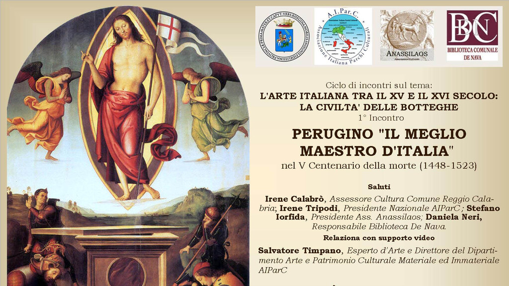 Giovedì 23 febbraio 2023 alle ore 17,00 presso la Sala Giuffrè della Biblioteca Pietro de Nava si inaugura un ciclo di incontri sul tema: “l'Arte italiana tra il XV e il XVI secolo: la civiltà delle botteghe” promosso congiuntamente, con il patrocinio del Comune di Reggio Calabria, dall’Associazione Culturale Anassilaos, dall’Aiparc (Associazione Italiana Parchi Culturali, dalla Biblioteca “Pietro de Nava”. Tema del primo incontro “Perugino «il meglio maestro d’Italia»” (1445-1450-1523) a Cinquecento anni dalla scomparsa dell’artista avvenuta nel febbraio del 1523. Interverranno Irene Calabrò, Assessore Cultura Comune di Reggio Calabria; Irene Tripodi, Presidente Nazionale Aiparc; Stefano Iorfida, Presidente Associazione Anassilaos; Daniela Neri, Responsabile Biblioteca De Nava. La relazione sarà tenuta da Salvatore Timpano, esperto d’arte e Direttore del Dipartimento Arte e Patrimonio Culturale Materiale ed Immateriale AIPARC. Maestro di Raffaello Sanzio, Piero Vannucci (1445/50-1523), detto il Perugino, nato, formatosi e morto in Umbria, fu tra i maggiori artisti che operarono tra la fine del Quattrocento e i primi decenni del Cinquecento.