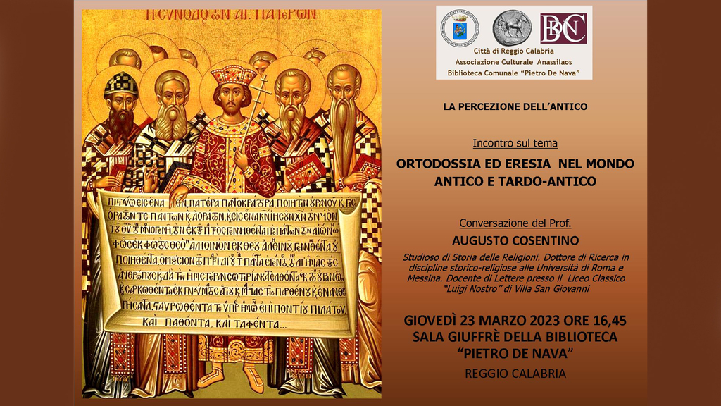 Ortodossia ed eresia nel mondo antico e tardo-antico” è il tema dell’incontro promosso dall’Associazione Culturale Anassilaos - riporta una nota -, congiuntamente con la Biblioteca “Pietro De Nava” e con il patrocinio del Comune di Reggio Calabria, nell’ambito degli incontri “La percezione dell’antico” volti ad approfondire aspetti e temi di quella che siamo soliti chiamare Antichità che si terrà giovedì 23 marzo alle ore 16,45 presso la sala Giuffrè della Villetta De Nava.