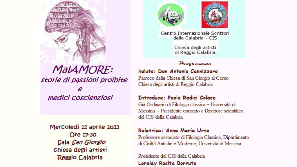Mercoledì 12 aprile 2023, alle ore 17:30, nella sala San Giorgio della chiesa degli artisti di Reggio Calabria, si parlerà di “MalAMORE: storie di passioni proibite e medici coscienziosi”. A darne notizia, una nota del Centro Internazionale Scrittori della Calabria.