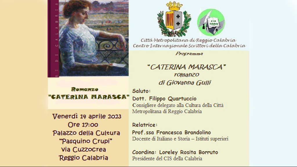 Dopo il saluto di Filippo Quartuccio, consigliere della Città Metropolitana delegato alla Cultura e di Loreley Rosita Borruto, presidente del Cis della Calabria, relazionerà Francesca Brandolino, docente di Italiano e Storia presso gli istituti superiori di Reggio Calabria. Il romanzo “Caterina Marasca”, pubblicato nel 1940, dopo la morte dell’autrice, dal carattere fortemente autobiografico racconta le aspettative e le aspirazioni di una donna immersa in una società stravolta dal bisogno e dalla sopraffazione. L’introspezione psicologica è una delle caratteristiche del romanzo della Gulli, grande scrittrice calabrese che meriterebbe un posto nella storia letteraria del Novecento italiano.