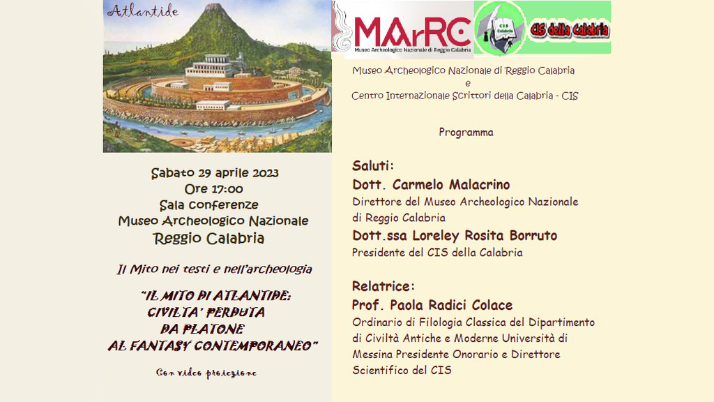 Intervengono: Carmelo Malacrino, Direttore del MArRC e Loreley Rosita Borruto, presidente del Cis della Calabria. Relatrice della conferenza sarà Paola Radici Colace, prof. ordinario di Filologia classica dell’Università di Messina, presidente onorario e direttore scientifico del Cis. Nei dialoghi “Timeo e “Crizia” Platone descrive una leggendaria isola, favolosamente ricca posta oltre le “Colonne d’Ercole”. Isola ricca di risorse naturali, signora incontrastata del Mediterraneo.