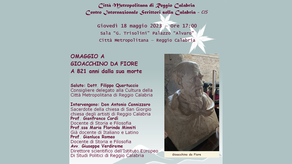 La Città Metropolitana di Reggio Calabria e il Centro Internazionale Scrittori, nell’ambito del ciclo “Gli scrittori calabresi”, giovedì 18 maggio, alle ore 17:00, nella sala “Trisolini” del Palazzo Alvaro svolgeranno la tavola rotonda del comitato Scientifico del Cis “Omaggio a Gioacchino da Fiore”. Ne dà notizia un comunicato del CIS della Calabria.