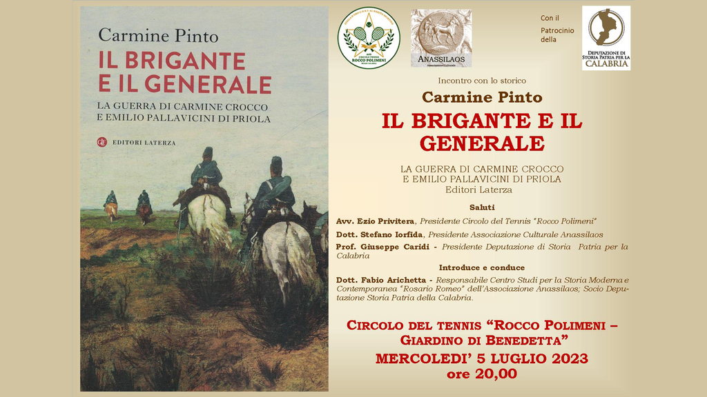 Ospite dell'Associazione Culturale Anassilaos lo storico Carmine Pinto, Ordinario presso l'Università degli Studi di Salerno di Storia Contemporanea nonché Direttore del Dipartimento di Studi Umanistici dell'Università di Salerno e titolare delle cattedre di Storia Contemporanea, Storia delle Istituzioni Contemporanee, Storia del Mezzogiorno e Storia dell'Ottocento, sarà a Reggio Calabria il 5 e il 6 luglio per due distinte manifestazioni. Mercoledì 5 luglio alle ore 20,00 presso il Circolo del Tennis Polimeni- Giardino di Benedetta presenterà il suo ultimo saggio storico, edito da Laterza Il brigante e il generale/La guerra di Carmine Crocco ed Emilio Pallavicini di Priola ”. A riferirlo, una nota dell'associazione culturale Anassilaos.