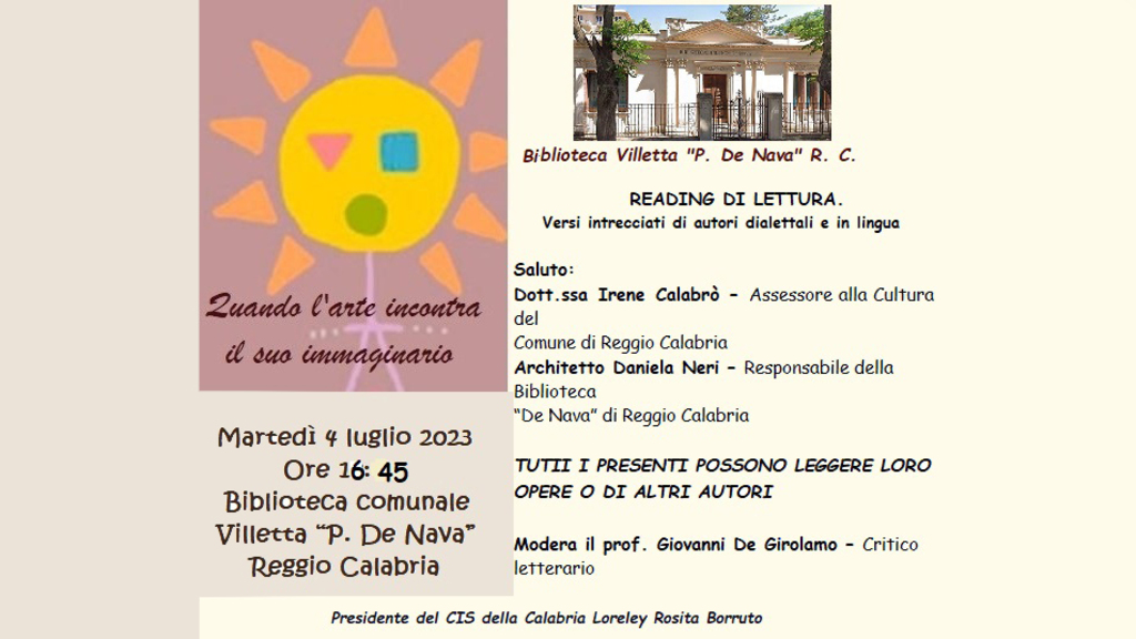 Martedì 4 luglio 2023, alle ore 16:45, presso la Biblioteca Villetta “P. De Nava”, la Città di Reggio Calabria, il Centro Internazionale Scrittori della Calabria e la stessa Biblioteca - è scritto in una nota -, promuovono l’incontro “Reading di lettura. Versi intrecciati di autori dialettali e in lingua”.