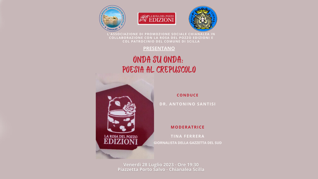 L’'Associazione di Promozione Sociale “Chianalea”, in collaborazione con La Rosa Nel Pozzo Edizioni e col Patrocinio del Comune di Scilla - si legge in una nota -, comunica che venerdì 28 luglio, a partire dalle ore 19:30, nella Piazzetta della Chiesa della Madonna di Porto Salvo a Chianalea Scilla, si terrà l’Incontro con poeti locali dal titolo "Onda su onda - Poesia al Crepuscolo”.