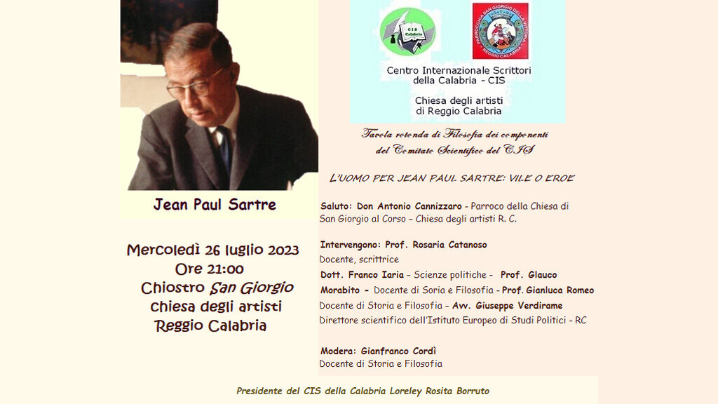 Nell’ambito degli incontri serali 2023 al Chiostro San Giorgio, il Centro Internazionale Scrittori e la chiesa degli artisti di Reggio Calabria - è scritto in una nota -, mercoledì 26 luglio, alle ore 21:00, promuovono la tavola rotonda di filosofia “l’uomo per Jean Paul Sartre: vile o eroe”.