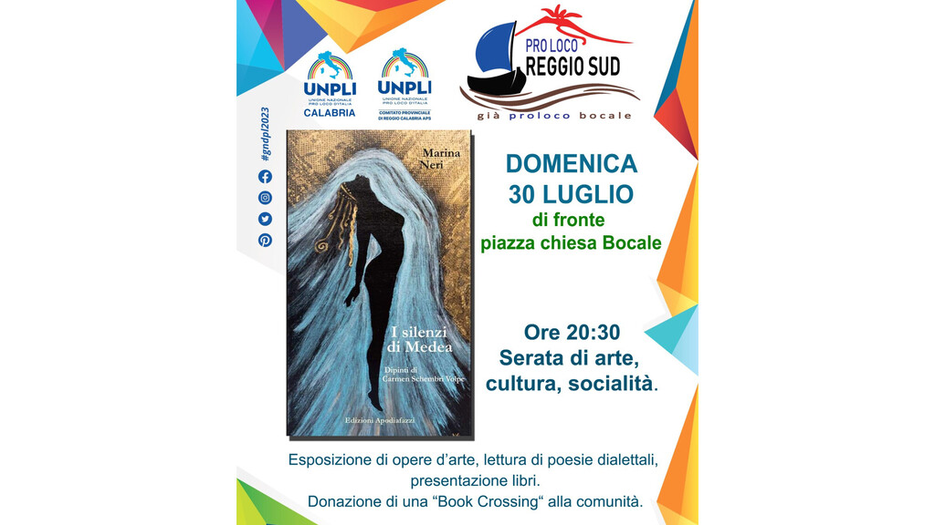 Proseguono le attività del calendario estivo della Pro Loco Reggio Sud APS. Domenica 30 Luglio dalle ore 20:30 a Bocale (RC) di fronte Piazza Chiesa dei S.S. Cosma e Damiano - si legge in una nota -, si svolgerà la manifestazione culturale: “Arte, cultura, socialità: Dopo il successo riscosso nel primo evento culturale in occasione della Giornata Nazionale delle Pro Loco d’Italia, si ritorna nelle piazze per farle rivivere, attraverso momenti di aggregazione, che vengono riproposti per valorizzare sempre più le eccellenze locali, promuovere la cultura del bello, l’arte attraverso l’esposizione di opere a cura di diversi artisti reggini, che faranno da cornice nella grande piazza, che ospiterà la scrittrice Marina Neri e l’artista Carmen Schembri Volpe che presenteranno il loro ultimo libro “I Silenzi di Medea”- edizioni Apodiafazzi.