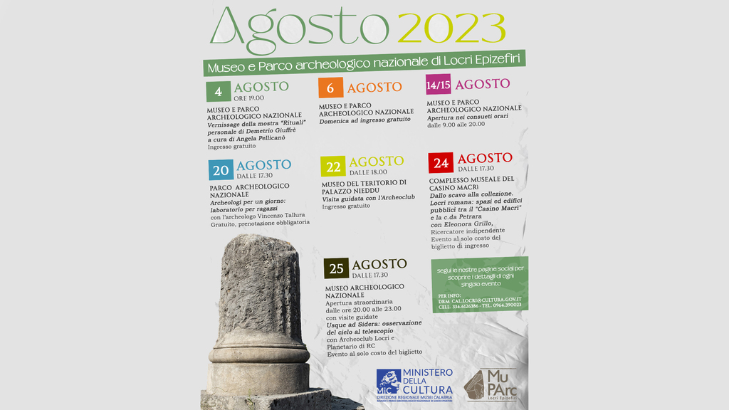 Il 24 agosto dalle ore 17.30 si svolgerà l'ultimo appuntamento del ciclo ideato e curato dalla Direttrice Trunfio “Dallo scavo alla collezione” con la ricercatrice indipendente Eleonora Grillo che si occuperà della Locri romana, conducendo i visitatori alla scoperta dell'area del Casino Macrì . L'evento si svolge al solo costo del biglietto d'ingresso.