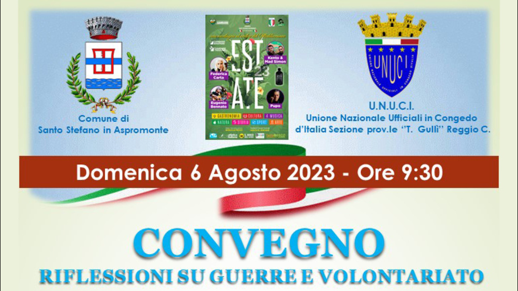 L’Amministrazione comunale di Santo Stefano in Aspromonte guidata dal sindaco Francesco Malara e la Sezione provinciale di Reggio Calabria dell’ U.N.U.C.I. – Unione Nazionale Ufficiali in Congedo d’Italia presieduta da Nicola Pavone hanno organizzato, nell’ambito delle attività culturali estive, il convegno “Riflessioni su Guerre e Volontariato” per domenica 6 agosto 2023 alle ore 9:30 presso il salone dell’ Hotel Miramonti di Gambarie. Lo riferisce una nota stampa dell'Unuci di Reggio Calabria.