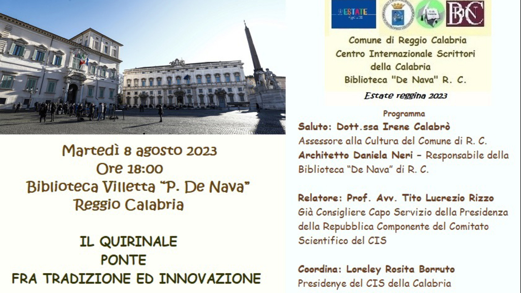 Martedì 8 agosto 2023, alle ore 18:00, presso la Biblioteca Villetta “P. De Nava”, la Città di Reggio Calabria, il Centro Internazionale Scrittori della Calabria e la stessa Biblioteca, nel contesto del programma “Estate reggina 2023” promuovono - si legge in una nota del CIS della Calabria, la conferenza “Il Quirinale ponte fra tradizione e innovazione””.
