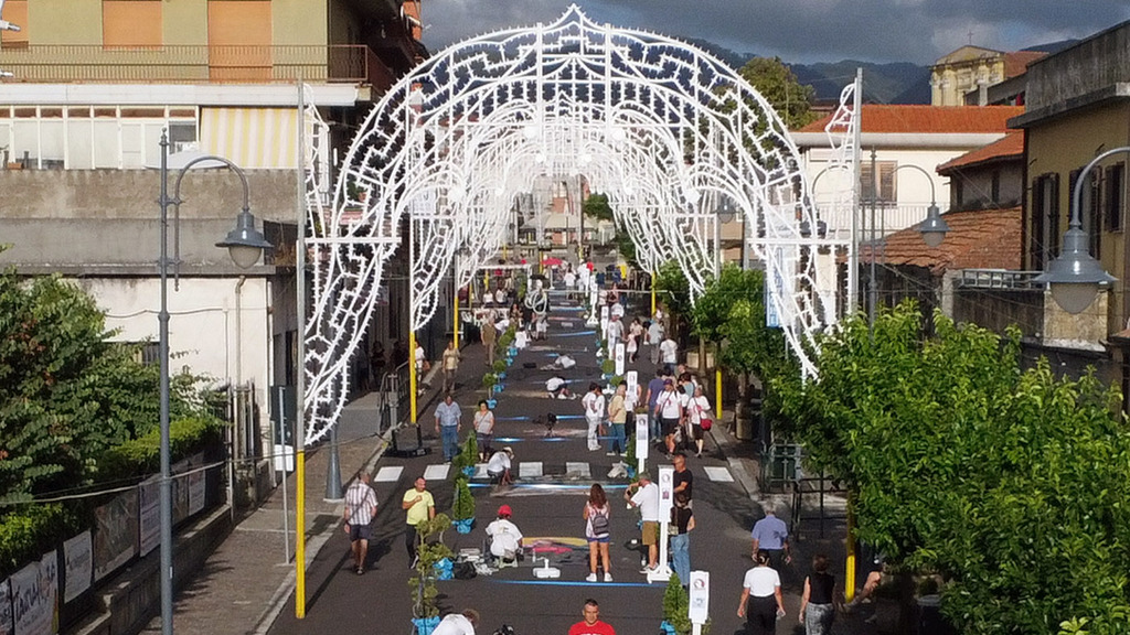 Un percorso di 800 metri al centro della città, diventato un tappeto prezioso grazie al sacrificio e al talento degli artisti internazionali che per via della pioggia che si è abbattuta abbondantemente nei primi giorni del concorso, hanno dovuto iniziare più volte le loro opere ispirate dal tema “Abbracci… oltre tempo”.
