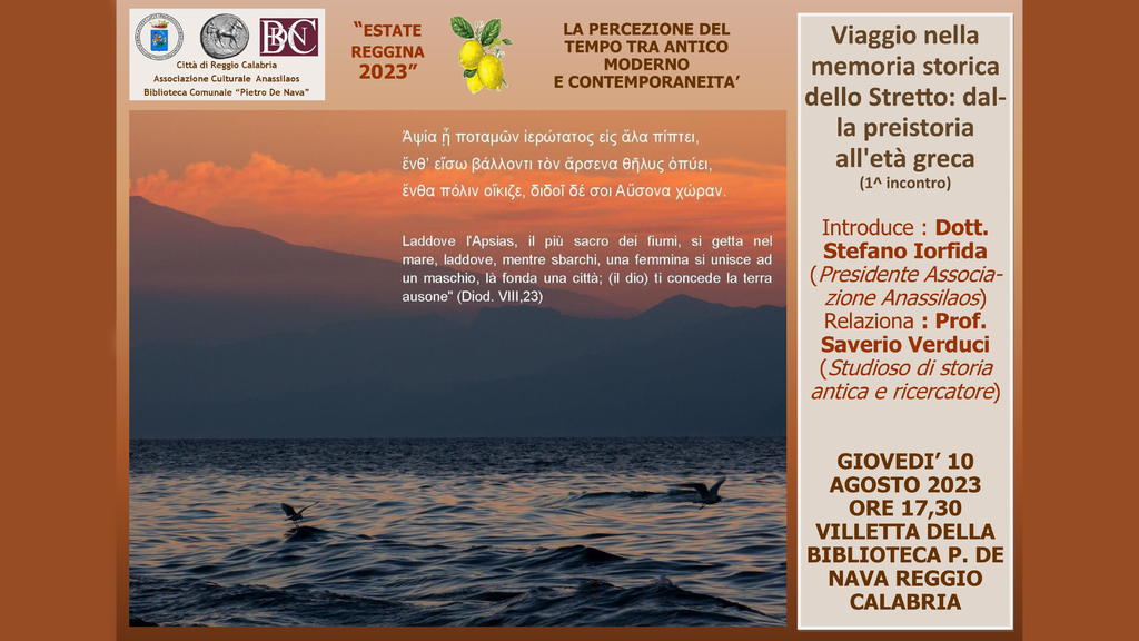 storica dello Stretto: dalla preistoria all'età greca”. Introdurrà Stefano Iorfida, Presidente Associazione Anassilaos.
