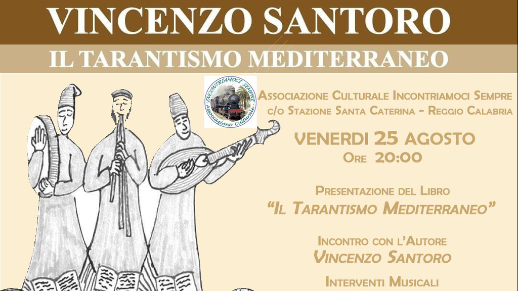 Un nuovo evento di interesse culturale apre con anticipo la stagione 2023-2024 dell’associazione Incontriamoci Sempre, venerdì 25 agosto ore 20:00 nel piazzale antistante la stazione di Santa Caterina a Reggio Calabria, è in programma la presentazione del libro ‘Il Tarantismo mediterraneo. Una cartografia culturale’ di Vincenzo Santoro che si concluderà con la degustazione del gelato artigianale offerto dalla gelateria Fragomeni di RC. Lo riferisce una nota dell'associazione.