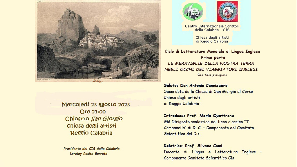 Nell’ambito degli incontri serali 2023 al Chiostro San Giorgio, il Centro Internazionale Scrittori e la chiesa degli artisti di Reggio Calabria, mercoledì 23 agosto, alle ore 21:00 - riferisce una nota -, per il ciclo di Letteratura Mondiale di Lingua Inglese promuovono la conversazione “Le meraviglie della nostra terra negli occhi dei viaggiatori inglesi”.