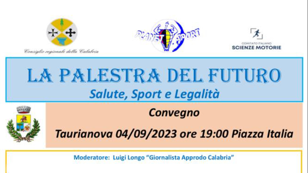 Tutto pronto per il convegno la palestra del futuro (salute , sport e legalità), si svolgerà giorno 4 settembre alle ore 19 a Taurianova in Piazza Italia.