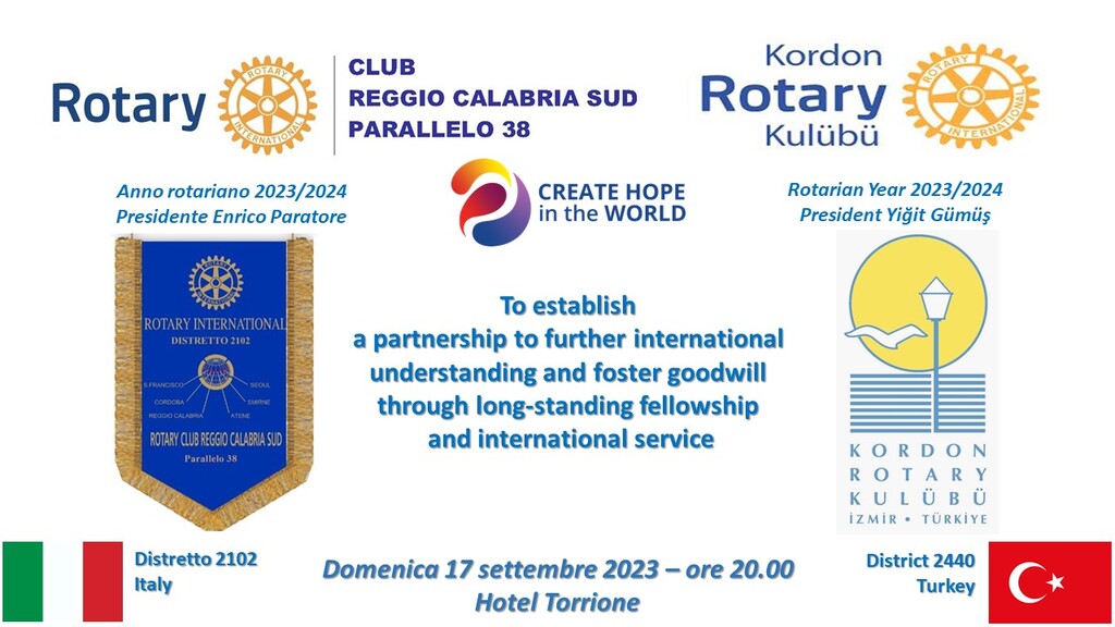 Con il Rotary Club Kordon di Izmir (Smirne) oltre che con quello di Atene e di San Francisco, il Rotary Club di Reggio Calabria Sud ha una collaborazione che dura nel tempo. In particolare, i due Club si sono fatti promotori di una iniziativa comune, nel segno della fratellanza tra i popoli, che hanno presentato al Congresso internazionale di Montreal nel 2009 ed hanno realizzato, nel 2019, con la collaborazione della Fondazione Rotary, un progetto per la duodenoscopia/enteroscopia pediatrica per il Dipartimento di Gastroenterologia dell’Università di Smirne, del valore di 50.000 dollari ed altri progetti hanno in programma di intraprendere in futuro, al fine sempre di promuovere la pace, in collaborazione anche con le Istituzioni locali.