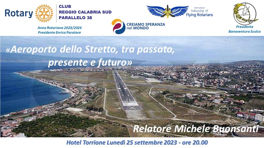 Se ne parlerà domani, 25 settembre 2023, alle ore 20.00, nell’incontro al “caminetto” organizzato, all’Hotel Torrione, dal Rotary Reggio Calabria Sud Parallelo 38 - si legge in una nota -, “Aeroporto dello Stretto, tra passato, presente e futuro”. con la partecipazione dell’Aero Club dello Stretto, che avrà come relatore Michele Buonasanti, docente di Modelli per la sicurezza delle infrastrutture e procedure della navigazione presso la facoltà di Ingegneria dell’Università Mediterranea e di Sicurezza del volo presso lo Stato Maggiore Aeronautica ed Investigatore Aeronautico sempre l’A.M.