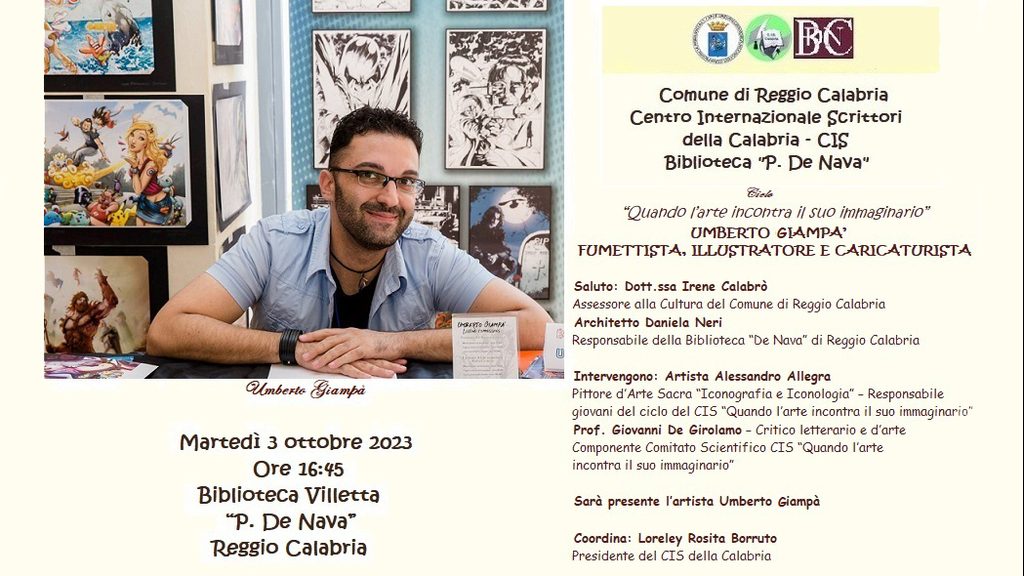 Martedì 3 ottobre 2023, alle ore 16:45, presso la Biblioteca Villetta “P. De Nava”, la Città di Reggio Calabria, il Centro Internazionale Scrittori della Calabria e la stessa Biblioteca, nell’ambito del ciclo “Quando l’arte incontra il suo immaginario” - riferisce una nota - promuovono il quarto incontro con l’artista Umberto Giampà, fumettista, illustratore e caricaturista.