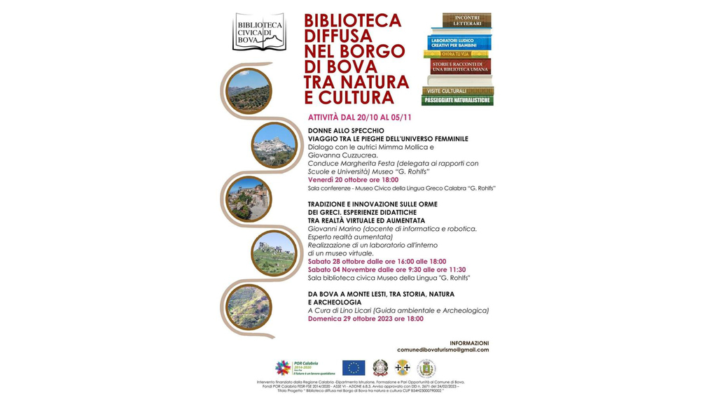Si aprirà con l'evento "Donne allo specchio - Viaggio tra le pieghe dell'universo femminile", in programma venerdì 20 ottobre alle ore 18:00 presso la sala conferenze del Museo Civico della Lingua Greco Lacabra "G. Rohlfs", il cartellone di incontri "Biblioteca diffusa nel borgo di Bova tra natura e cultura". Un dialogo con le autrici Mimma Mollica e Giovanna Cuzzocrea moderato da Margherita Festa, delegata ai rapporti con Scuole e Università del Museo "G. Rohlfs".