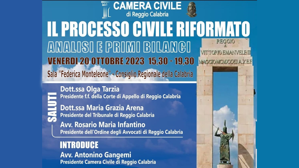 La Camera Civile di Reggio Calabria ha organizzato l'incontro "Processo Civile Riformato - Analisi e primi bilanci" che si svolgerà venerdì 20 ottobre, dalle ore 15:30 presso la sala "F. Monteleone" del Consiglio Regionale della Calabria.