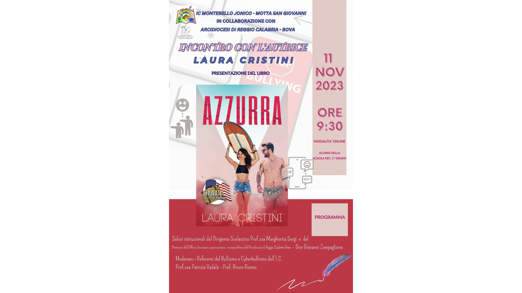 «È un modo per dare dei messaggi positivi in un mondo difficile, senza valori e oserei dire a volte senza.Dio - prosegue don Zampaglione -. Ringrazio a questo proposito la dirigente scolastico professoressa Margherita Sergi con la quale c 'è stata subito una buona intesa e sinergia, che si è immediatamente impegnata a preparare un incontro che si terrà sabato 11 novembre alle 9:30. Oltre agli interventi dei professori Romeo Bruno e Patrizia Vadalà, ci sarà quello (modalità online) di Laura Cristini che presenterà il suo libro "Azzurra ", un romanzo che racconta la caduta, le sfide e la rinascita di un 'adolescente , grazie a un gruppo di amici e a un amore, alla saggezza di un maestro di surf ma, soprattutto, grazie alla forza che la giovane protagonista trova dentro di sé e la porterà ad accettarsi e amarsi con le sue fragilità e le sue imperfezioni».