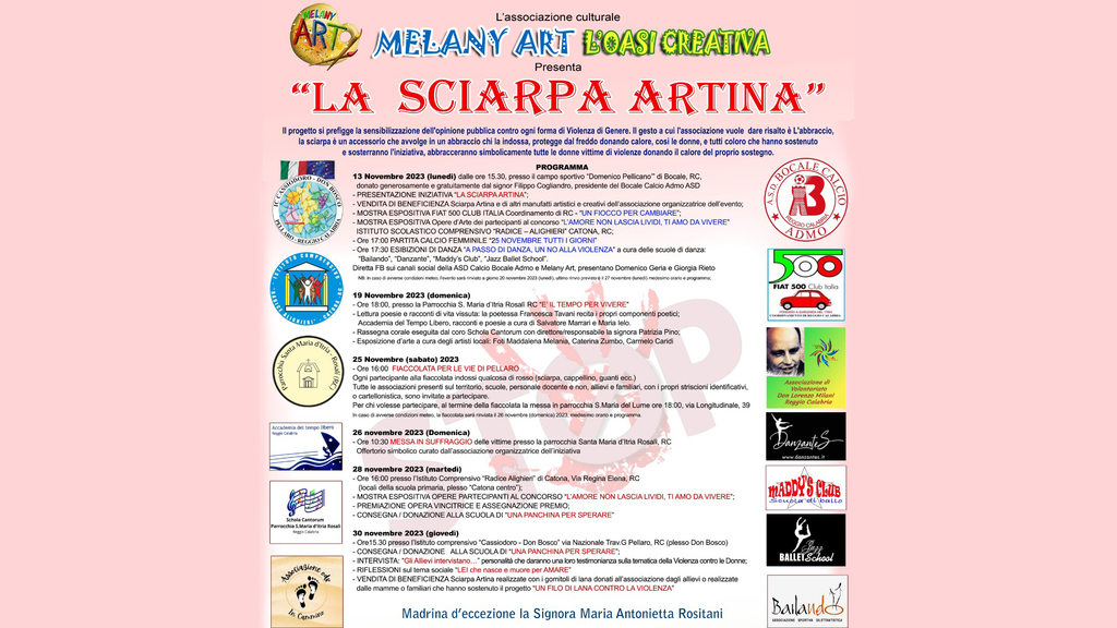 Il gesto a cui l’associazione vuole dare risalto è l’Abbraccio, la sciarpa è l’ accessorio per eccellenza che avvolge chi lo indossa, protegge dal freddo donando calore, così le donne, e tutti coloro che hanno sostenuto e sosterranno l’iniziativa, abbracceranno simbolicamente tutte le donne vittime di violenza donando il calore del proprio sostegno. Madrina dell’iniziativa la Sig.ra Maria Antonietta Rositani, donna reggina vittima di violenza e sempre attenta  nell’importante opera di sensibilizzazione contro ogni forma di Violenza di Genere,ed a cui l’associazione devolverà il ricavato della vendita di beneficienza delle sciarpe. La Sciarpa Artina si svolgerà in varie zone del territorio reggino. La giornata che darà il via all’intera iniziativa sarà giorno 13 Novembre 2023 (lunedì), presso il campo sportivo “Domenico Pellicanò” via Campoli 2 Bocale RC, gentilmente e gratuitamente donato come location dal Sig. Filippo Cogliandro, presidente dell’ ASD Bocale Calcio ADMO, sempre pronto e disponibile verso le tematiche sociali di sensibilizzazione,  e grazie alla collaborazione del suo responsabile alle tematiche sociali il dott. Filippo Pollifroni, nonché presidente dell’associazioni “Don Milani” ed all’instancabile Mister  Enzo Bevacqua ed a tutte le maestranze sportive che ruotano attorno a questa bella società sportiva che nel tempo ha raggiunto grandi e importanti risultati.