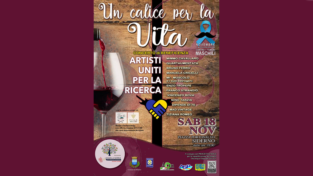 Ancora un evento di sensibilizzazione e solidarietà: dopo il mese di ottobre dedicato alla prevenzione dei tumori femminili, novembre è il momento della prevenzione dei tumori maschili. Per informare sul tema e sostenere il progetto NOLE per la riqualificazione del reparto di oncologia dell’ospedale di Locri, l’Associazione “Angela Serra” - sezione Locride, con il patrocinio del Comune di Siderno e della Regione Calabria, organizza “Un calice per la vita”, sabato 18 novembre, a partire dalle 15.30, in Piazza Portosalvo a Siderno.