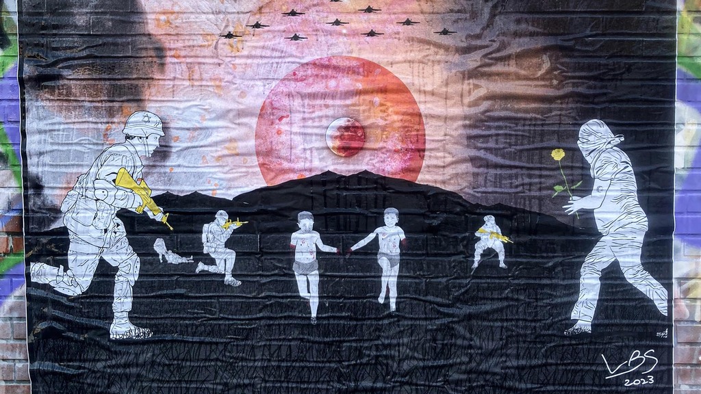 Questa mattina a Milano, 19 novembre 2023, in Via Giovanni Scheiwiller, zona Porta Romana e Fondazione Prada, è apparsa un’opera di street art di grandi dimensioni raffigurante la guerra tra Israele e il mondo arabo dal titolo “Terra non santa”. L’opera è un disegno digitale stampato su manifesto blueback realizzata dal giovane artista calabrese LBS (Salvatore Bruno Latella). Fondatore dell’idea di Globalized Street Art.