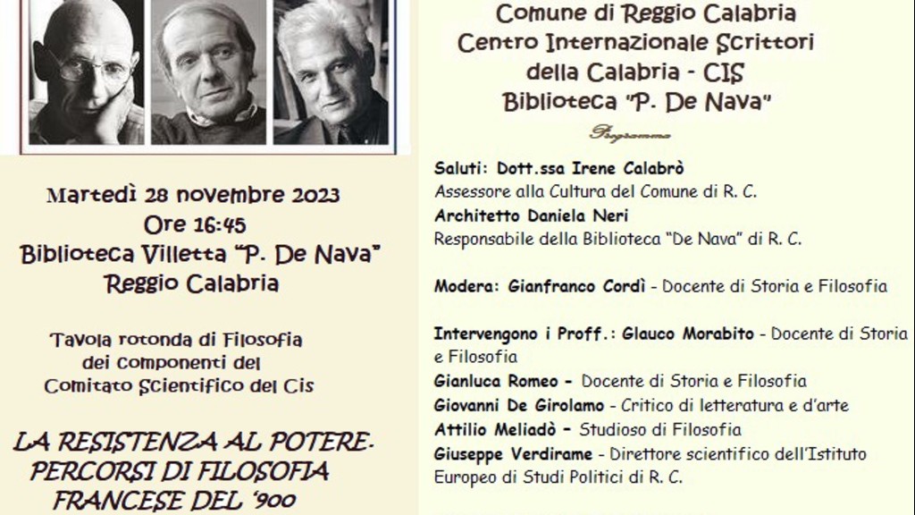 Oggi Martedì 28 novembre, alle ore 16:45, il Comune di Reggio Calabria, il Centro Internazionale Scrittori e la Biblioteca “De Nava”, nella sala convegni della stessa Biblioteca promuovono la conferenza con i componenti del Comitato Scientifico del Cis dal titolo “La resistenza al potere, percorsi di filosofia francese del ‘900”. Introducono la manifestazione: Irene Calabrò, assessore alla Cultura del Comune di Reggio Calabria; Daniela Neri, responsabile della Biblioteca; Loreley Rosita Borruto, presidente del Cis della Calabria. Coordina i lavori Gianfranco Cordì, docente di Storia e Filosofia. Intervengono i proff.: Glauco Morabito, docente di Storia e Filosofia; Gianluca Romeo, docente di Storia e Filosofia; Giovanni De Girolamo, critico di Letteratura, Attilio Meliadò, Studioso di Filosofia; Giuseppe Verdirame, Direttore scientifico dell’Istituto Europeo di Studi Politici di Reggio Calabria.