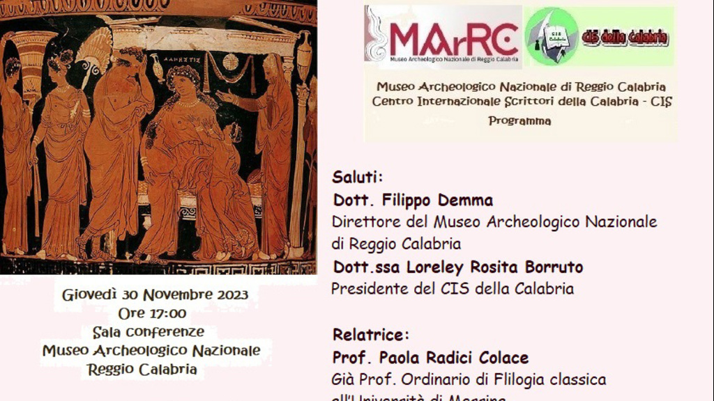 Giovedì 30 novembre 2023, alle ore 17:00, il Museo Archeologico Nazionale di Reggio Calabria e il Centro Internazionale Scrittori della Calabria, promuovono la conferenza “Alcesti” di Euripide. Eroina del sacrificio: un amore che vale la vita. Aprono l’incontro gli interventi di Filippo Demma, direttore del MArRC e di Loreley Rosita Borruto, presidente del Cis della Calabria. Con il contributo di slides, relaziona Paola Radici Colace, già ordinario di Filologia Classica all’Università di Messina, presidente onorario e direttore scientifico del Cis della Calabria. La tragedia “Alcesti” di Euripide, rappresentata nel V secolo a, C., narra la storia e l’eroismo di Alcesti che si sacrifica per il bene della sua famiglia. La trama descrive la storia del re Admeto di Tessaglia, che sul punto di morire, Apollo, il dio del sole gli concede la possibilità di potere continuare a vivere purché trovi qualcuno disposto a morire al suo posto. L’unica persona che accetta di sacrificarsi al posto di Admeto è la moglie Alcesti. Admeto, addolorato e sconvolto per la perdita della moglie, riconosce il vero e profondo amore di Alcesti, perché solo chi ama è disposto a sacrificare la propria vita per la persona che ha consacrato il proprio cuore. Eracle, eroe greco, che arriva al palazzo di Admeto, ravvisa l’eroismo di Alcesti e decide di sfidare Thanatos, il dio della morte, e lo convince a rinunciare alla vita di Alcesti.