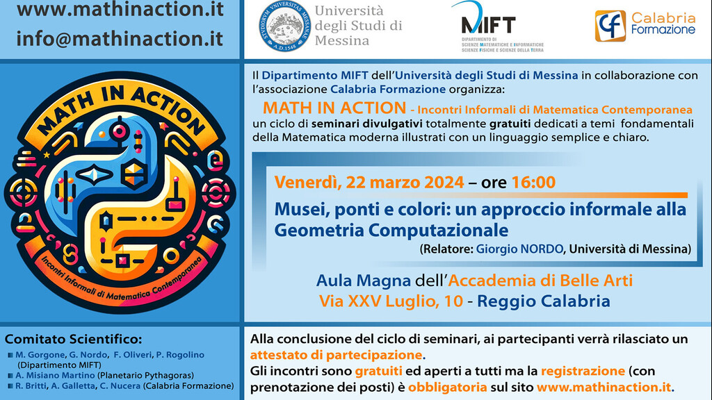 Si terrà il prossimo venerdì 22 marzo alle ore 16:00 nell’Aula Magna dell’Accademia di Belle Arti a Reggio Calabria, il primo seminario di divulgazione scientifica dal titolo “Musei, ponti e colori: un approccio informale alla Geometria Computazionale”, il primo incontro del ciclo di seminari gratuiti dedicati a temi di ricerca della Matematica moderna rivolti a tutti ed illustrati utilizzando un linguaggio semplice e comprensibile.