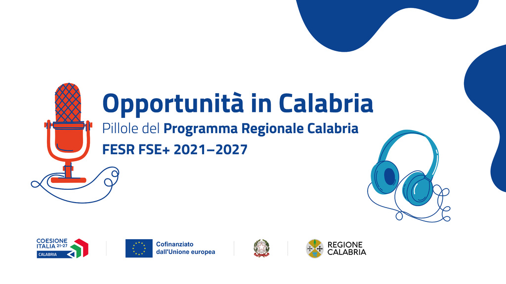 È online su Spotify la serie podcast “Opportunità in Calabria: Pillole del PR Calabria FESR FSE+ 21–27”, realizzata in collaborazione con Fincalabra S.p.A, nell’ambito della campagna di comunicazione del Programma Regionale Calabria FESR FSE+ 2021–2027.