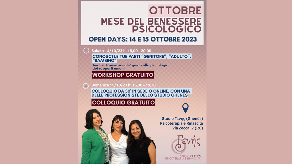 Anche quest'anno, in occasione di "Ottobre mese dedicato al benessere psicologico", lo studio di psicoterapia e rinascita Ghenés - si legge in una nota -, apre le porte con due iniziative gratuite di formazione e psicoterapia per promuovere la crescita personale e migliorare la qualità della vita.