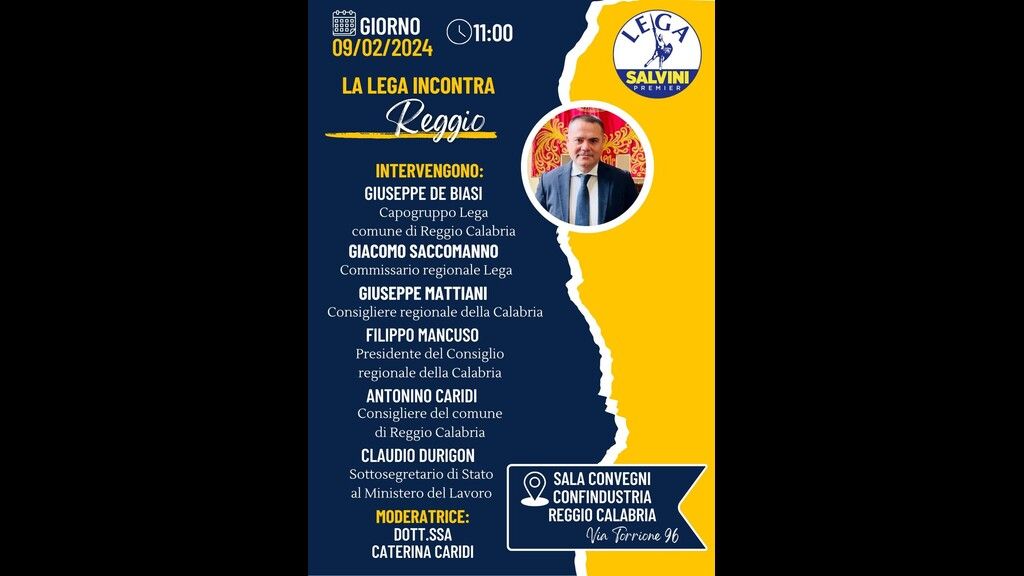 È previsto per il giorno 9 febbraio 2024, alle ore 11:00, un importante incontro della Lega a Reggio Calabria. La riunione si terrà presso la sala convegni di Confindustria, situata in Via Torrione 96. Durante l'incontro, saranno presenti importanti esponenti della Lega, tra cui Giuseppe De Biasi, Capogruppo Lega del comune di Reggio Calabria, Giacomo Saccomanno, Commissario regionale Lega, Giuseppe Mattiani, Consigliere regionale della Calabria, Filippo Mancuso, Presidente del Consiglio regionale della Calabria, Antonino Caridi, Consigliere del comune di Reggio Calabria e Claudio Durigon, Sottosegretario di Stato al Ministero del Lavoro.