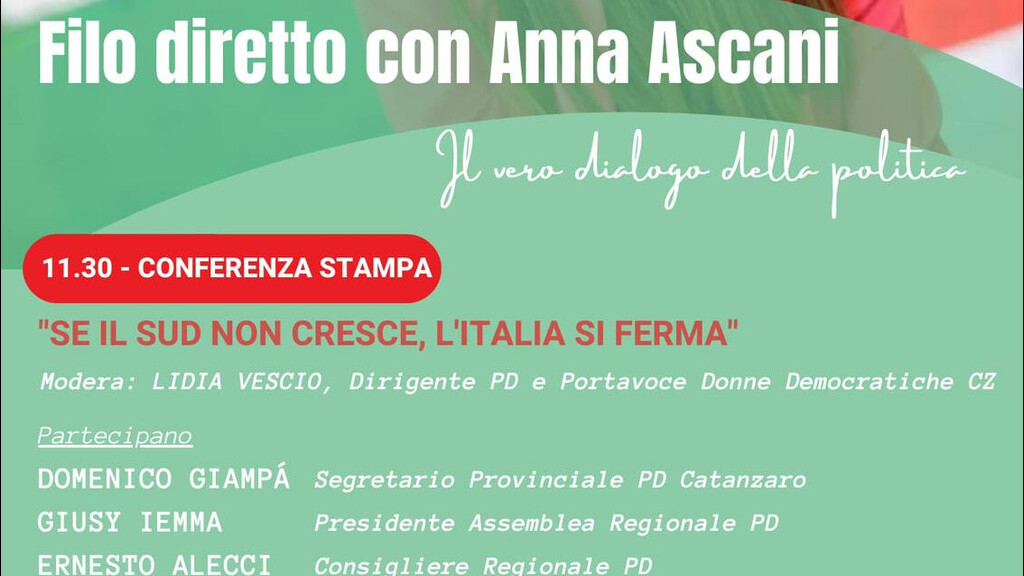 "Il 28 febbraio 2024 nella sede regionale Calabria del Partito Democratico, in via delle Nazioni a Lamezia Terme, si terrà un evento con l’on. Anna Ascani, vice presidente della Camera dei Deputati, all’interno dell’iniziativa nazionale “Filo Diretto”. La tappa calabrese, voluta e organizzata da Lidia Vescio, dirigente del PD e Portavoce delle Donne Democratiche della provincia di Catanzaro, inizierà alle ore 11,30 con una conferenza stampa incentrata su un tema attuale e cruciale per il Sud, l’autonomia differenziata." a darne notizia un comunicato stampa.