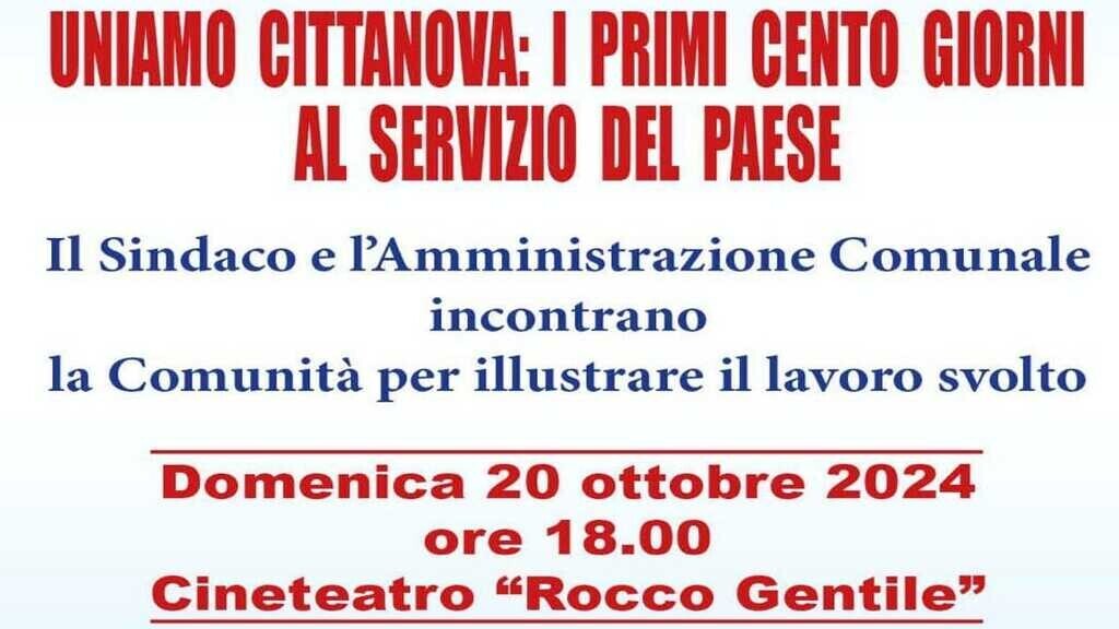 La coalizione “Uniamo Cittanova”, al fine di alimentare e rafforzare il percorso di confronto e comunicazione con la Comunità locale, nel segno della partecipazione e del coinvolgimento civico attivo, nella giornata di domenica 20 ottobre, alle ore 18,00 presso il Cineteatro “Rocco Gentile”, svolgerà un incontro con la cittadinanza per il racconto dei primi cento giorni di attività amministrativa al servizio del paese.